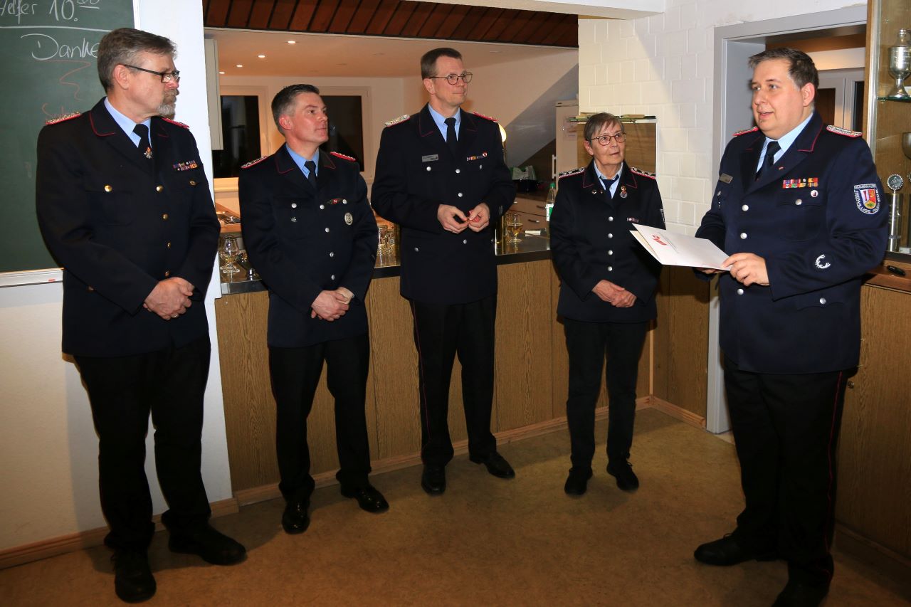 Amtsleiter Tobias Grote, stellv. Gemeindebrandmeister Holger Gottschling, Brandabschnittsleiter Heiko Böhlken, Ortsbürgermeisterin Sabine Warkentin und eine Abordnung der Partnerfeuerwehr Emmenhausen (Allgäu) besuchten die Versammlung als Gäste.