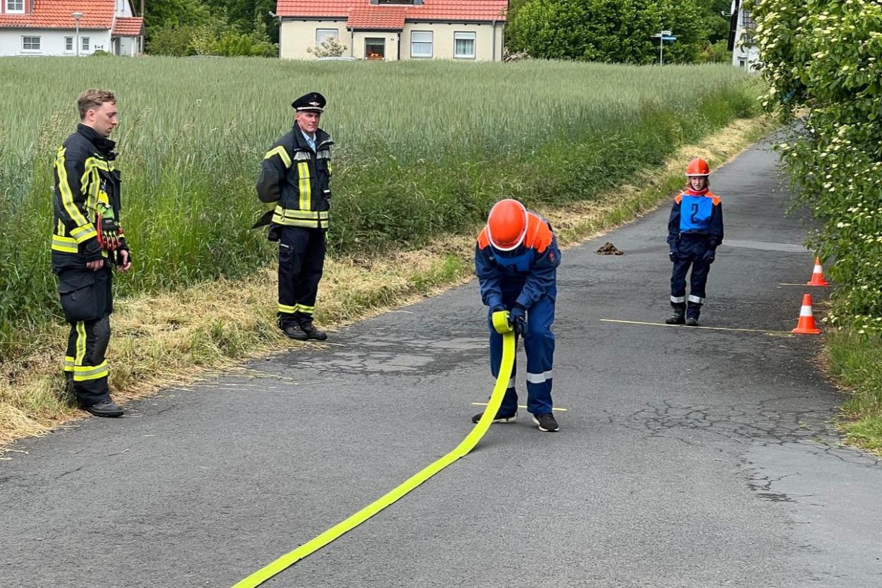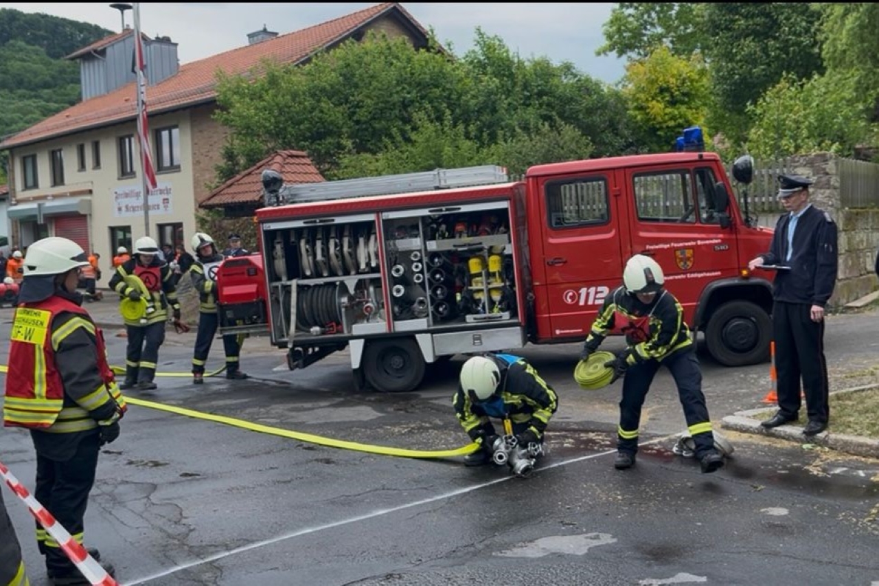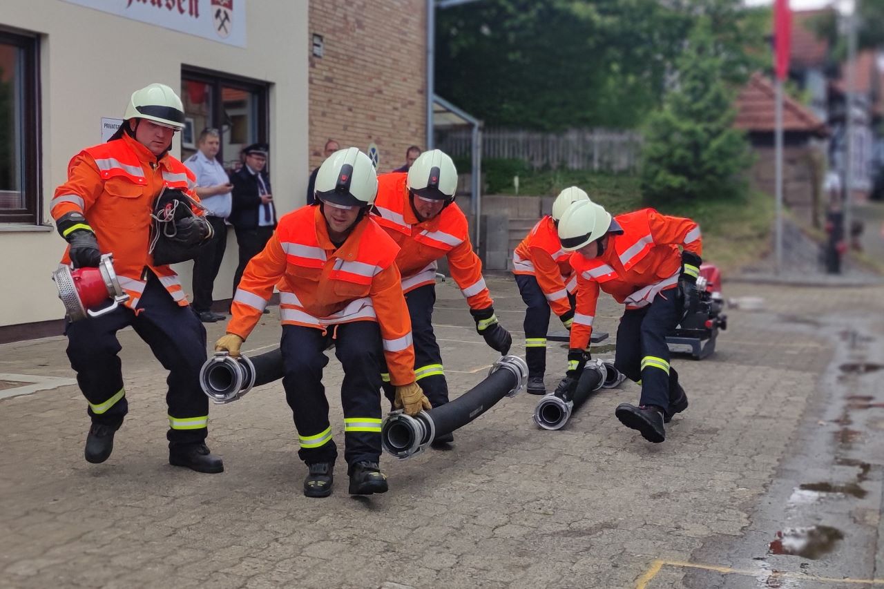 Reyershausen - Am Samstagnachmittag (24.05.2025) starteten die Einsatzabteilungen mit den Leistungsvergleichen. Dabei galt es drei Prüfungen abzulegen. Die erste Prüfung ein Löschangriff, wo während der Brandbekämpfung ein Schlauchplatzer simuliert und dadurch ein Schlauch getauscht werden musste.