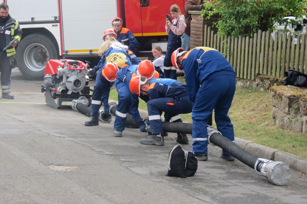 Am Sonntagvormittag fand der feuerwehrtechnische und sportliche Wettbewerb der Jugendfeuerwehren statt. Auch die Jugendlichen mussten einen Löschangriff aufbauen und zusätzlich am Ende der Bahn Knoten an einem Gestell binden. Im sportlichen Teil legten die neun Läufer eine 400 Meter Strecke zurück und erledigten auch hier teils Aufgaben bei der Staffelübergabe. Einen C-Schlauch einrollen, über ein Brett laufen, einen Knoten binden und eine Leine ins Ziel werfen, waren einige der Aufgaben auf der Laufstrecke.