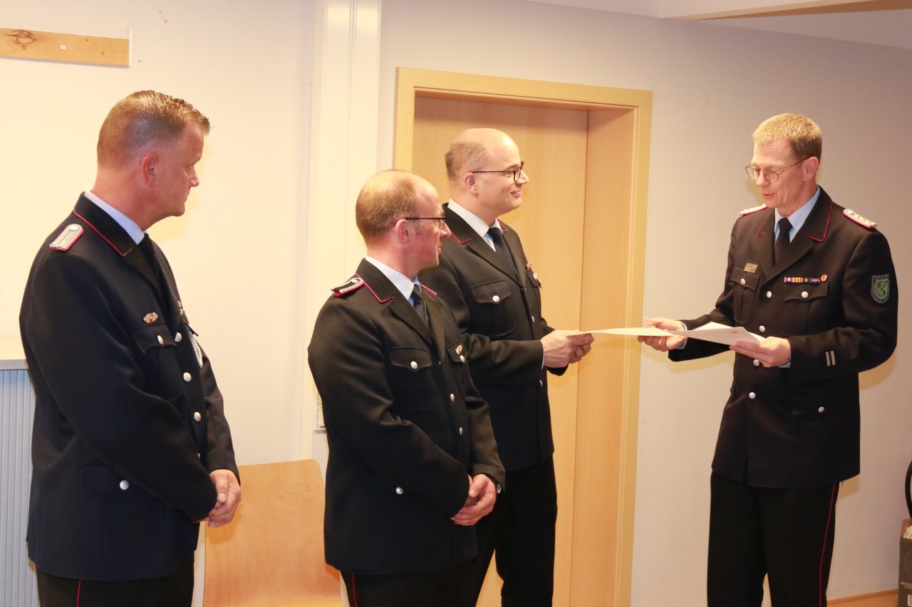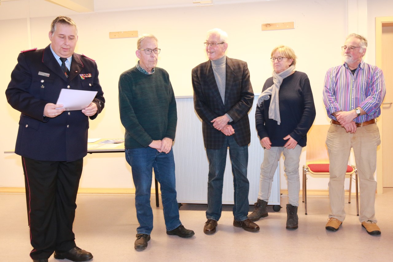 Bürgermeister Thomas Brandes, Amtsleiter Nicholas Krengel, Ortsbürgermeister Bernd Riethig, stellv. Gemeindebrandmeister Holger Gottschling und Vertreter des Kreisfeuerwehrverbandes Göttingen Marcel Lahrsow besuchten die Versammlung als Gäste.