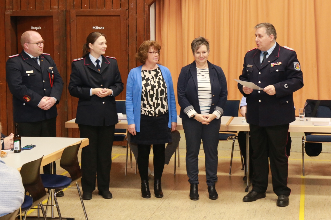 Amtsleiter Nicholas Krengel, Ortsbürgermeisterin Ilona Meyer, Gemeindebrandmeister Markus Füllgrabe und Vertreter des Kreisfeuerwehrverbandes Göttingen Marcel Lahrsow besuchten die Versammlung als Gäste.