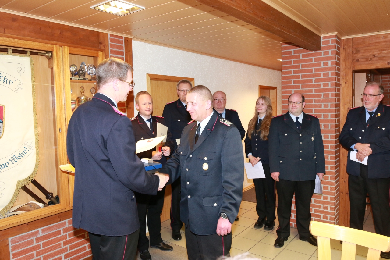 Ortsbrandmeister Sven Wellhausen berichtete von personellen Veränderungen im vergangenen Jahr. So habe er das Amt von Thomas Gerke übernommen und Maxine Födisch die Funktion von Alexander Klapprtoh als neue Stellvertreterin. Durch die Veränderung musste Födisch ihr Amt als Jugendfeuerwehrwartin an Robin Födisch abgeben. Unterstützt wird Robin Födisch von seiner neuen Stellvertreterin Sophie Leiske. Wellhausen bedankte sich für die Bereitschaft neue Aufgaben und Verantwortung zu übernehmen. An Thomas Gerke und Alexander Klapproth übergab Wellhausen ein Geschenk und bedankte sich bei beiden für ihr Engagement.