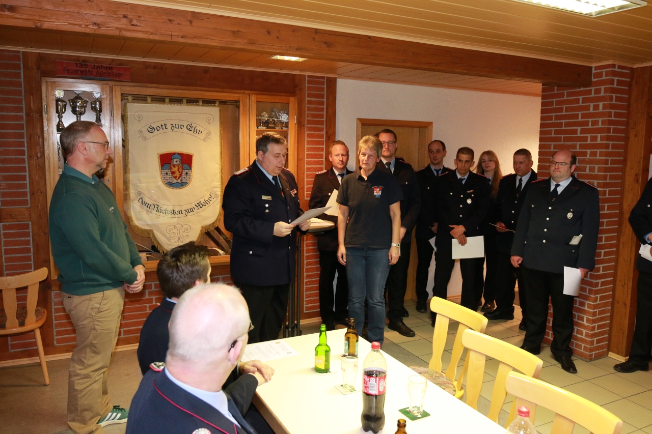 Erster Gemeinderat Florian Petrow, Ortsbürgermeister Hans Schäfer, stellv. Gemeindebrandmeister Holger Gottschling und Vertreter des Kreisfeuerwehrverbandes Göttingen Marcel Lahrsow besuchten die Versammlung als Gäste.