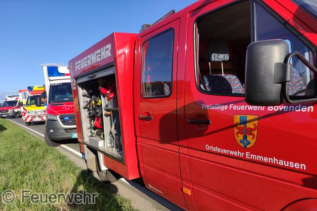 Emmenhausen – Bei einem Verkehrsunfall auf der Landstraße L554 kurz nach dem Ortsausgang Emmenhausen kam es Richtung Erbsen zu einem Verkehrsunfall zweier Pkw. Die Ortsfeuerwehren Emmenhausen und Lenglern sicherten die Einsatzstelle ab und betreuten bis zum Eintreffen des Rettungsdienstes die Verletzten. Zum Glück gab es nur fünf Leichtverletzte und keine der Personen war im Fahrzeug eingeklemmt, wie es zu erst in der Alarmierung hieß. Somit konnte die Ortsfeuerwehr Bovenden ihre Anfahrt abbrechen. Weiterhin wurden auslaufende Betriebsstoffe aufgenommen und bei der Reinigung der Straße unterstützt.