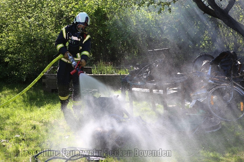 Bovenden – Ein Brand brach in einem Garten in der Straße „Mühlenweg“ im Ortsteil Bovenden aus. Bei Ankunft der alarmierten Ortsfeuerwehren brannte eine Freifläche im Garten und griff auf eine Gartenlaube über. Die Einsatzkräfte löschten den Brand mit einem C-Rohr. Verletzt wurde niemand. Die als Lager dienende Gartenlaube wurde leergeräumt und die Gegenstände weiter abgelöscht. Während des Einsatzes wurde der Mühlenweg für den Verkehr gesperrt.