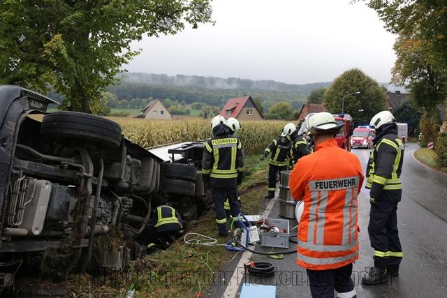 Billingshausen – Am Donnerstagmorgen ereignete sich ein Lkw-Unfall auf der Bundesstraße B44 in einer Kurve kurz nach der Ortschaft Billingshausen in Richtung Spanbeck. Ersthelfer betreuten den Fahrer des mit rund 25.000 Liter Milch beladenden Lkw, bis die Rettungskräfte eintrafen. Der verletzte Fahrer wurde vom Rettungsdienst ins Krankenhaus transportiert. Die Einsatzkräfte sicherten die Einsatzstelle ab und legten Ölsperren. Rund 10.000 Liter Milch und ca. 100 Liter Kraftstoff sind in einem Graben gelaufen, der in den Rodebach mündet. Im Tank verbliebender Kraftstoff wurde von den Einsatzkräften abgepumpt. Die Milch wurde in einen weiteren Lkw umgefüllt. Kurz nach 10 Uhr rückten die Feuerwehren wieder ein. Die Einsatzstelle bleibt bis zum Ende der Bergungsarbeiten komplett gesperrt.